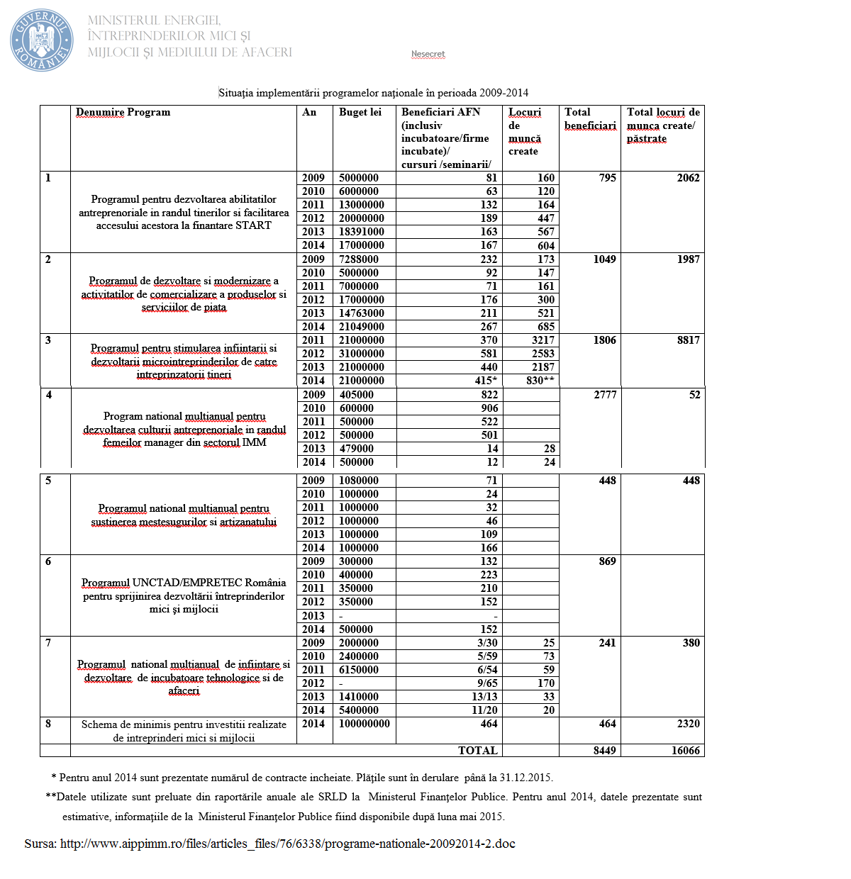 Astfel, prin „Programul pentru dezvoltarea și stimularea înființării microîntreprinderilor de către întreprinzătorii tineri” s-au înființat mai mult de jumătate din totalul locurilor de muncă apărute prin toate cele 8 programe active în perioada 2009-2014 (puțin peste 16.000, conform ultimelor date oficiale publice ale AIPPIMM).