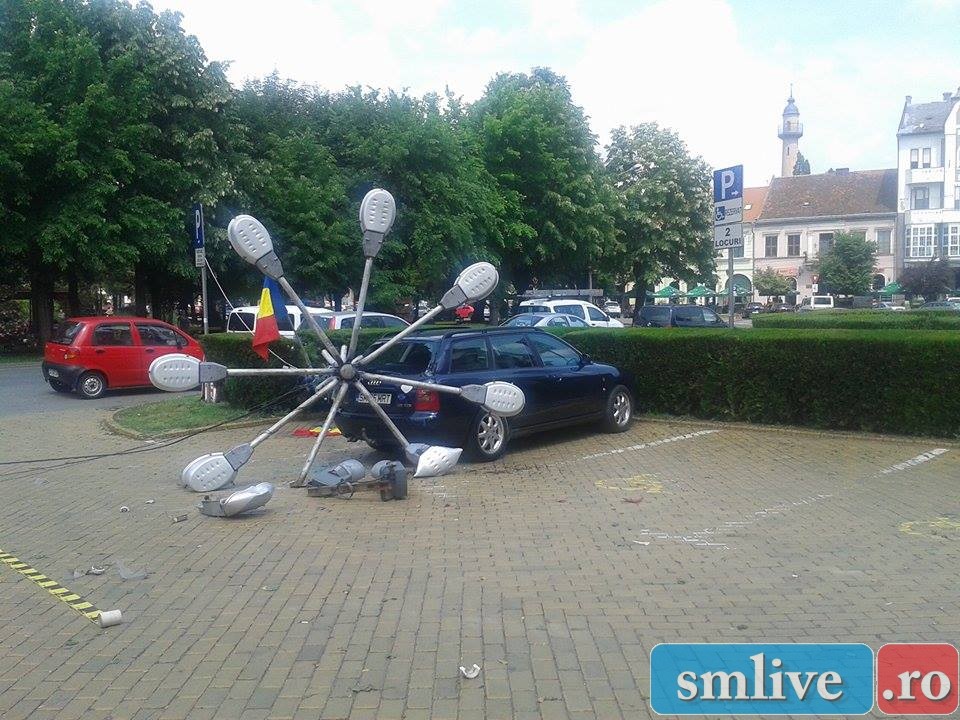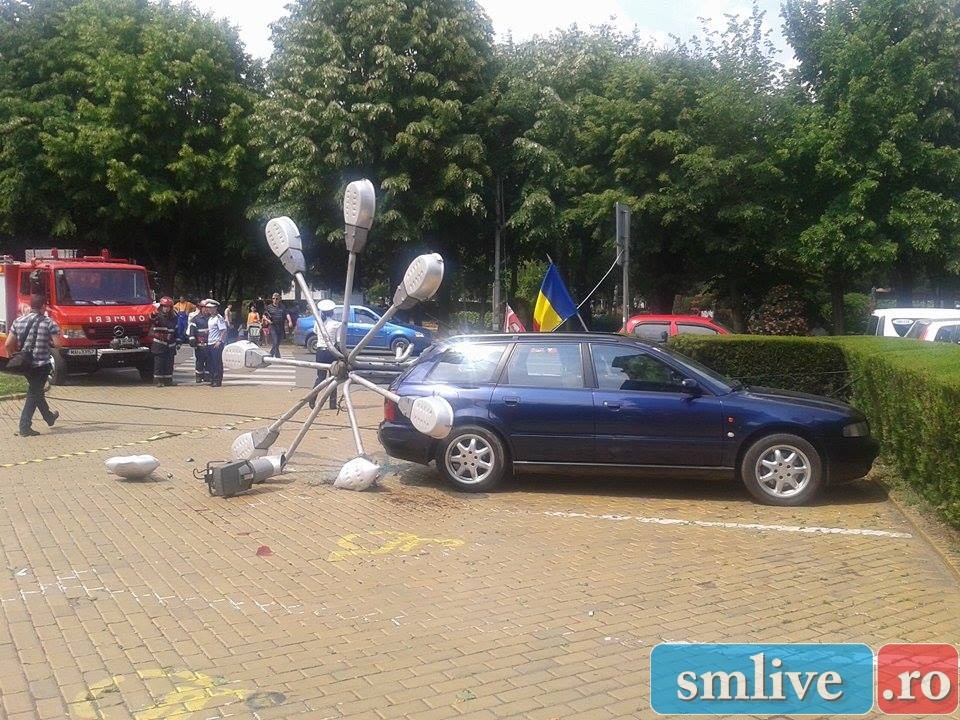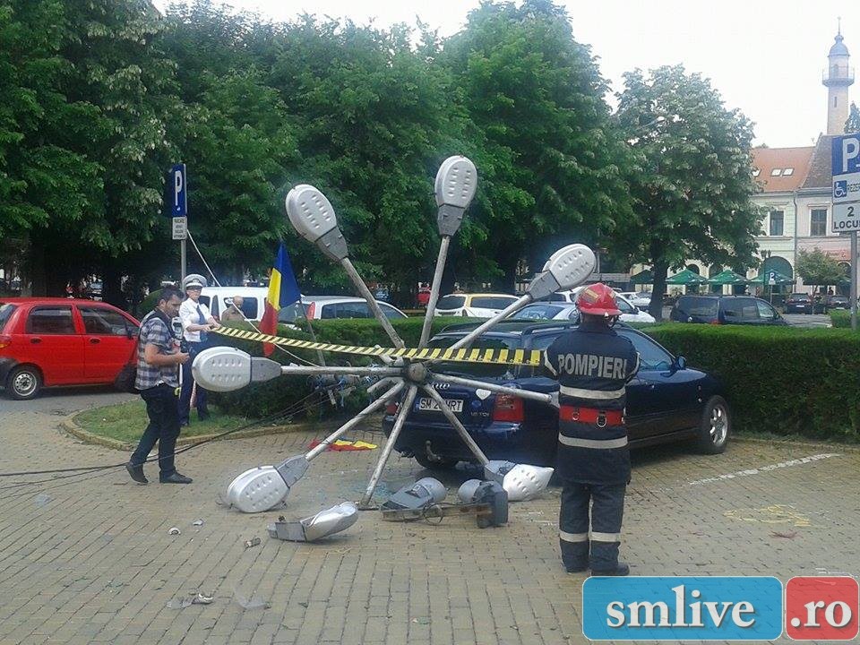 Un autocar a intrat in parcarea din fata catedralei , unde erau mai multe taximetre parcate si alte cateva masini . Autocarul a agatat un fir electric conectat la stalp de iluminat public, tragand dupa el stalpul si cauzand caderea zgomotoasa a acestuia. In cadere stalpul a avariat un autoturism din apropiere. Locul a fost impanzit la scurt timp de echipe de interventie, Electrica, Politie. Din fericire nu s-au inregistrat victime.