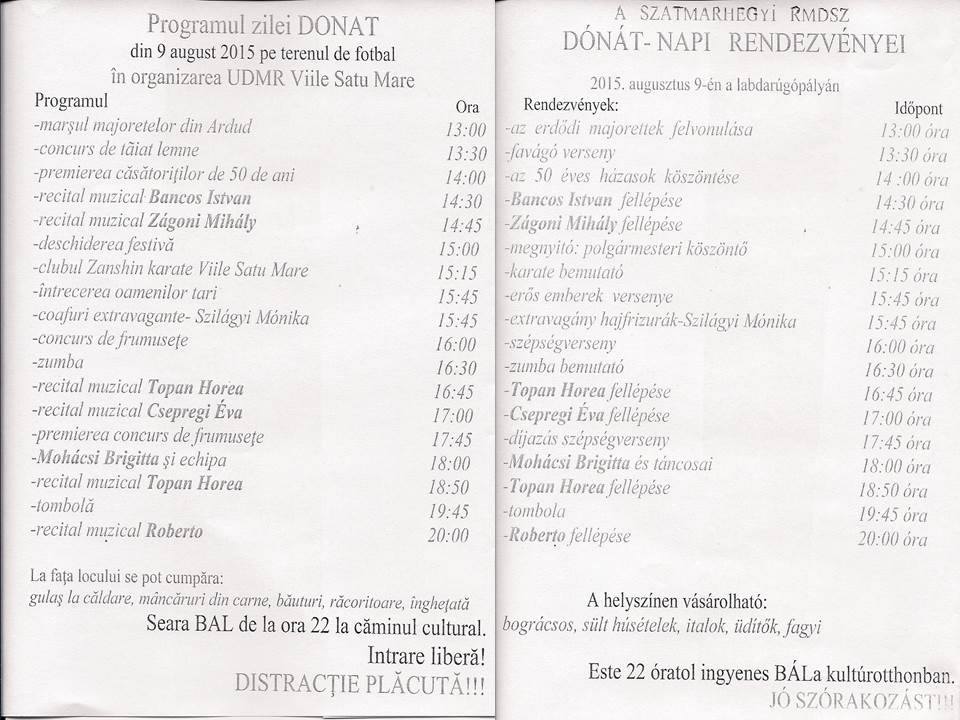 Anul acesta Donat-ul se va sarbatori duminica 9 August 2015 pe terenul de fotbal din localitatea Viile Satu Mare. Vremea se anunta buna , chiar daca un pic calduroasa iar satmarenii sunt invitati sa ia parte la aceasta Sarbatoare care pentru cei din Viile Satu Mare si din imprejurimi tine de traditie , Donat-ul fiind tinut in luna august din vremuri stravechi.
