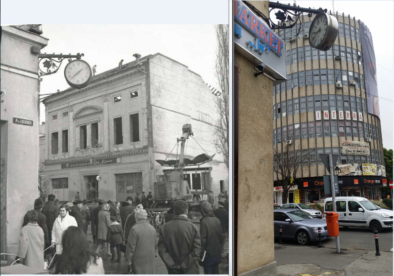 Multi dintre noi nu stiu ca in locul actualei „CASE DE MODA„ era in anii 60, Restaurantul CINA. Asa ca  va propunem o parabola peste  timp, din aceeasi perspectiva a coltului renumit al Satmarului unde este „CEASUL ELECTRIC„! Diferenta este de o jumatate de secol.